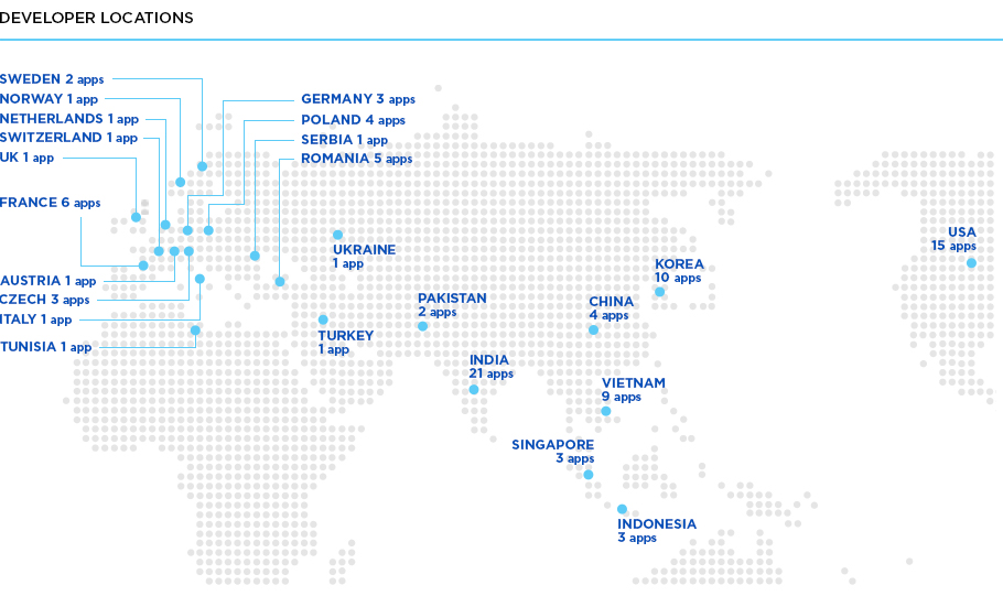 Так, например, разработчики из США сумели вывести в TOP100 сразу 15 приложений, южнокорейцы отметились 10-ю продуктами, Вьетнам (что удивительно) - 9-ю. "Безтайзеновая" Франция отличилась 6-ю полезными продуктами. Также отметились Румыния (5), Китай (4), Польша (4).